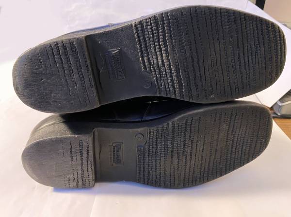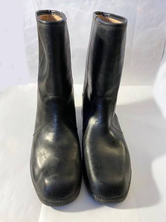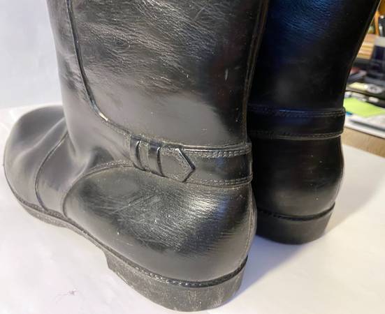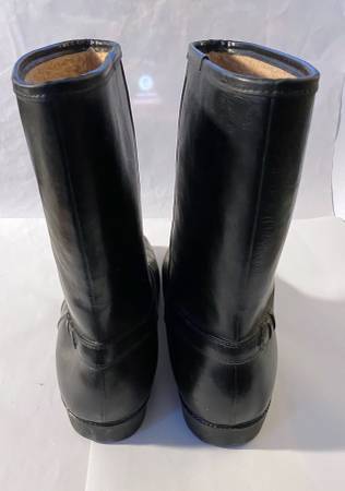 Not sure of the brand - they say "Waterproof Guaranteed" Made in the U.S.A. on the bottom. Nice black leather pull on boots in good shape. Size 12 mens I believe - could be unisex. Have a faux buckle on the ankle of each. Pull on with cotton lining. I pretty good shape - just don't fit me anymore. See photos for details.