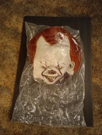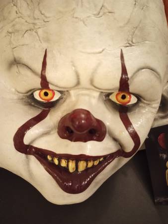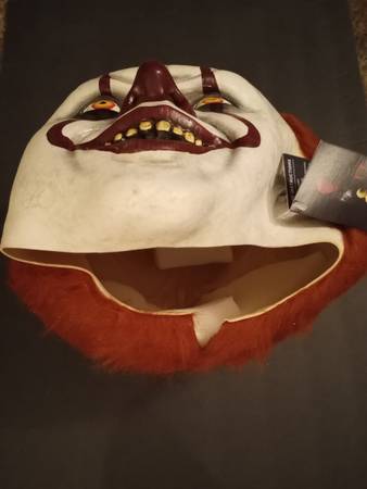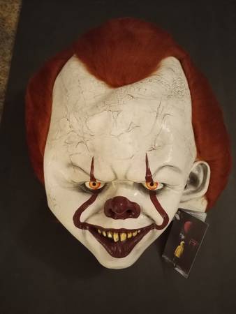 Halloween's coming! Full cover "Pennywise The Clown" mask from the Stephen King's movie "IT." New in the box, well made full cover, flexible rubber face mask with red-fabric hair. If ad is showing, it's available. Reply with phone number by email/ chat feature for a call back. Please no texting.