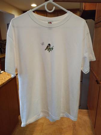 10. 'Like New' white T-Shirt with a bird and butterfly - Size Large. Asking $4.00.