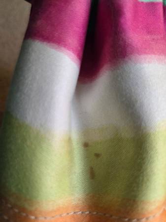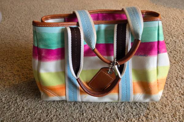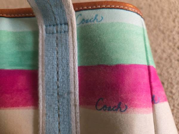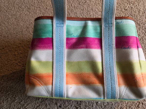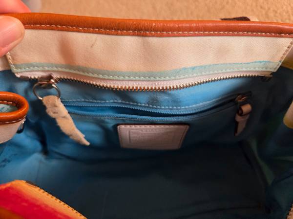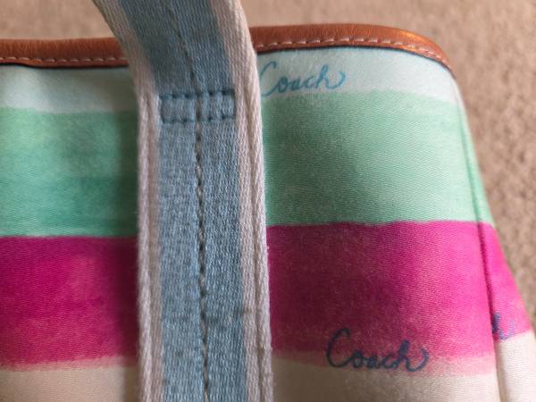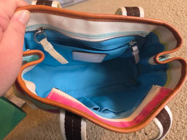 Gently used and in excellent condition, there are 2 small spots on the outside but it looks great and is very pretty. This is a Coach Hampton Watercolor bag, it's about small to medium size. It has 2 light blue handles with carmel brown leather accents. The inside is also a light blue with a zipper closure. There is one inside compartment with side pockets. 1 side pocket is a zipper closure and the other are open pockets. Very pretty and comes with a brown fabric storage bag.