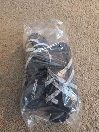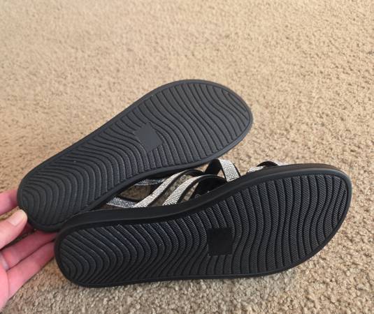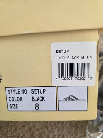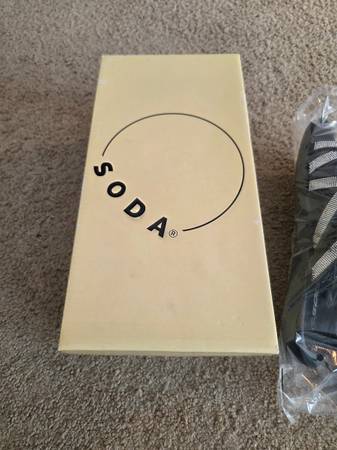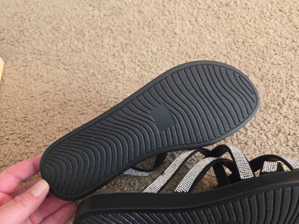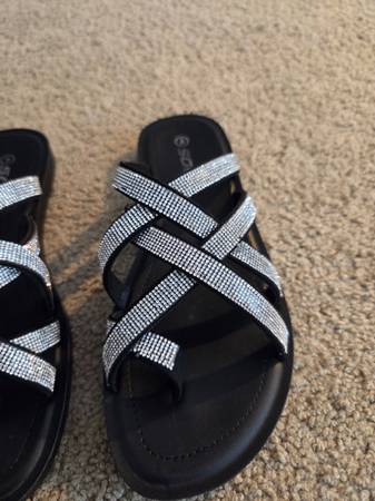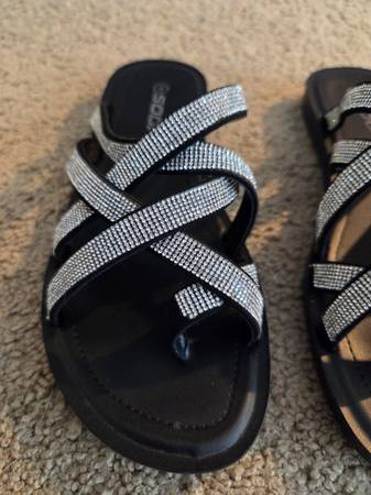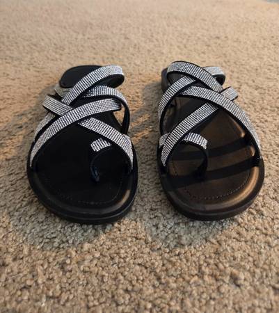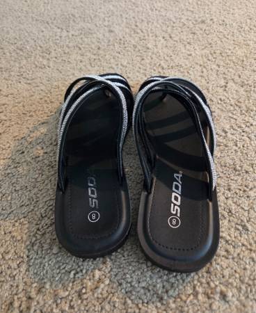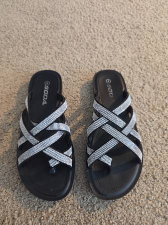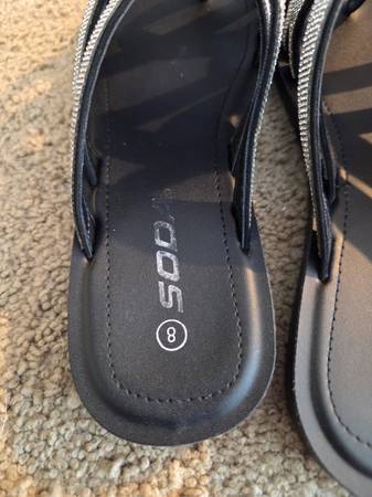 Worn once, in excellent condition, almost like new. The Soda logo on the right sanded is rubbed off in places, otherwise like new. They are a women's size 8 black flat strappy sandals with toe ring. The tops of the straps have small sparkly gems, very pretty and sparkly. Comfortable and fashionable. Comes in original packaging.