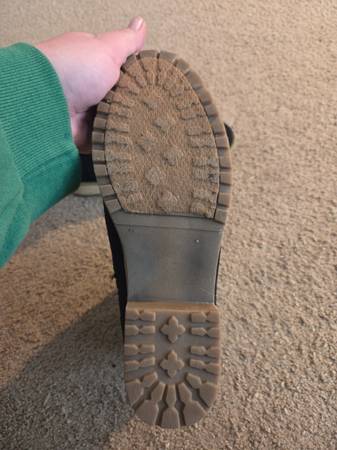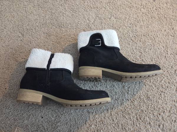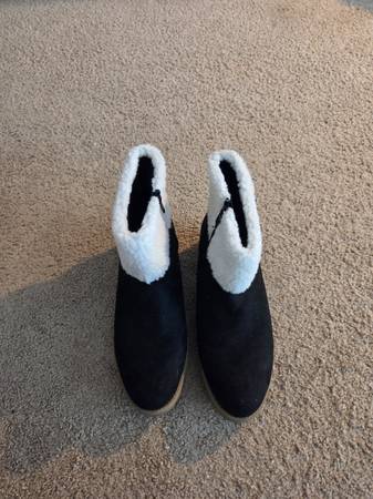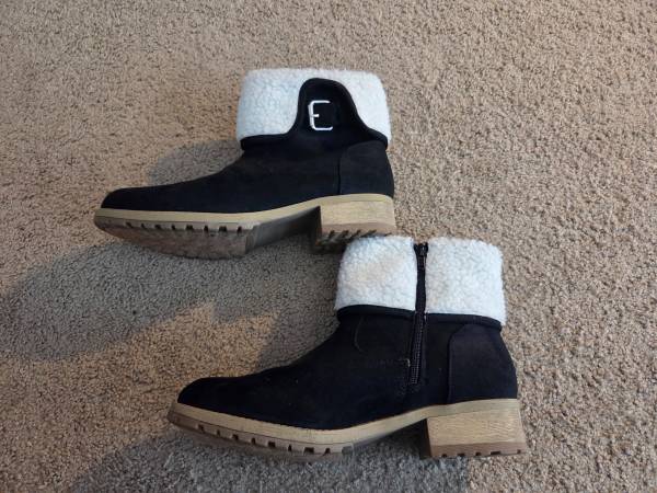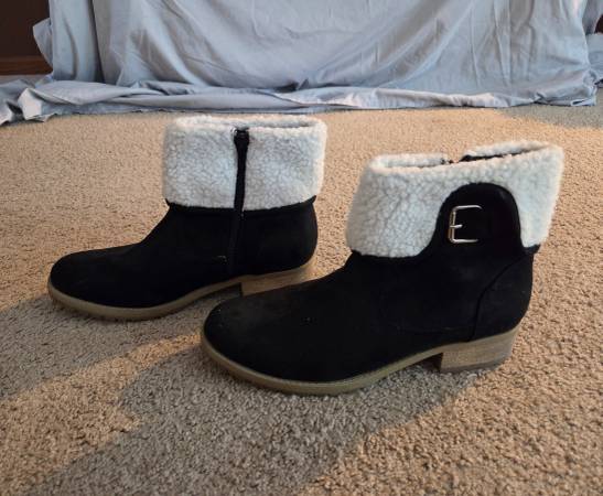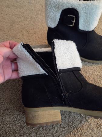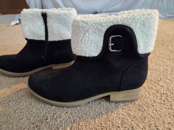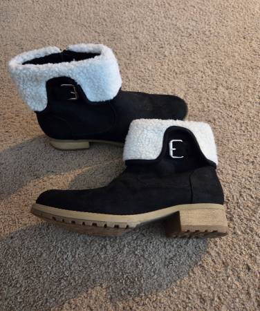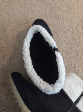 Worn once and in excellent condition. Pair of pretty women's winter boots size 10. They are black with beige soles, white fuzzy bright white tops and a decorative silver metal buckle on the sides .They have a black side zipper for a closure. They have a small heel and they are warm.