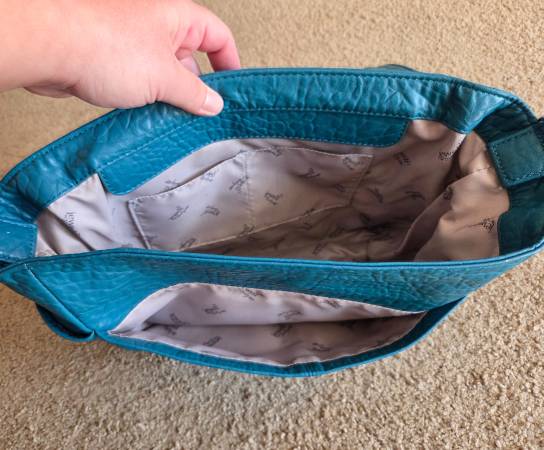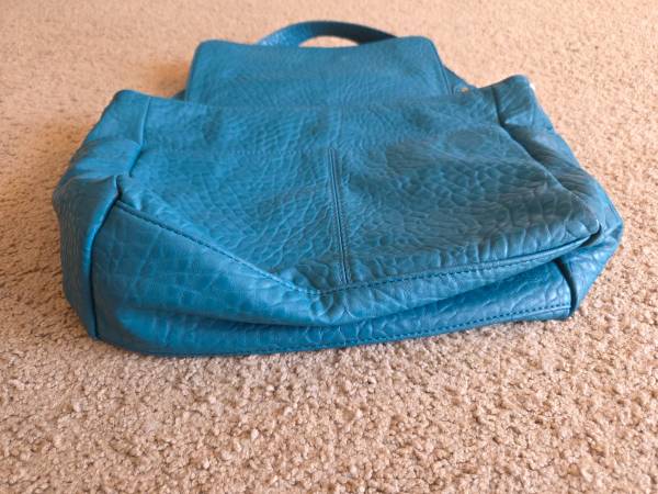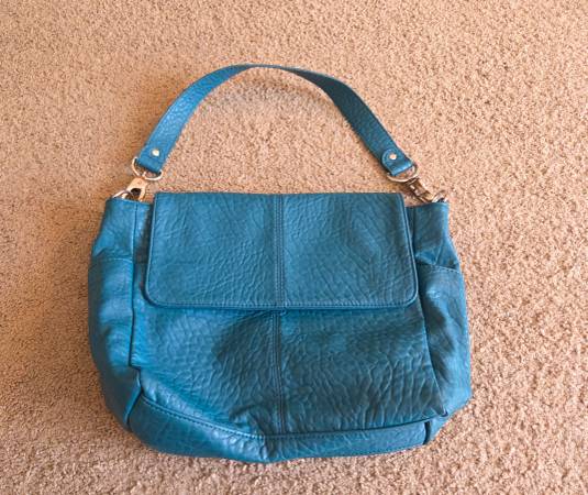 Gently used and in excellent condition, like new. This is a Thirty One Jewell teal pebbled shoulder bag. It has a large handle with heavy duty metal clips on both sides. It has a small inside pocket, large flap cover, 1 large outside pocket and a large open area with 2 small side pockets on the inside. It's 11x5 inches.