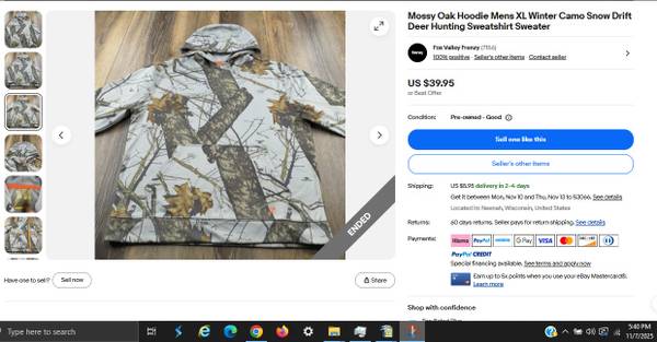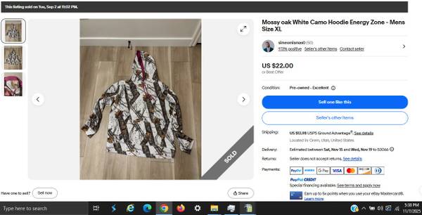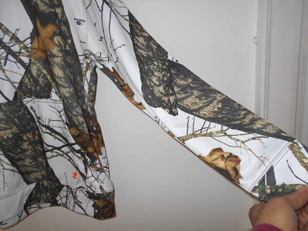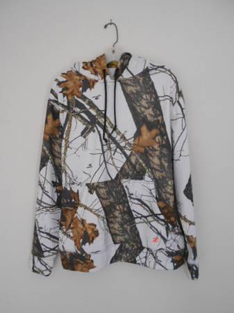 Offering a Men's Mossy Oak White Camo Hoodie by Energy Zone in Men's Size Medium 38-40. Barely worn and in excellent condition. Great for hunters or just casual wear. It's 100% Polyester and has a few wrinkles from being stored in a tote.