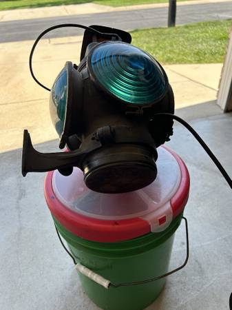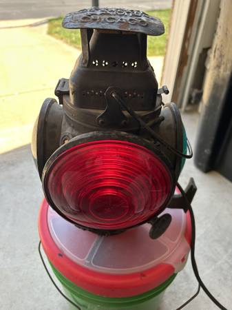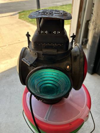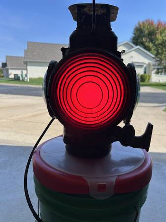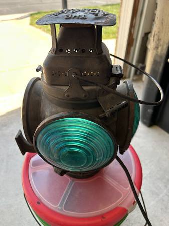Very old Canadian Pacific caboose lantern, original condition except that it does NOT have a kerosene font inside but has been electrified with about a ten foot long cord with plug for 110 volt outlet.