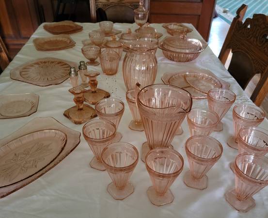 Adam pink depression glassware, 37 pieces. Includes rare 7 ½” vase, candle sticks and covered butter. Was $790 now $390 or best offer.