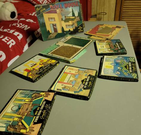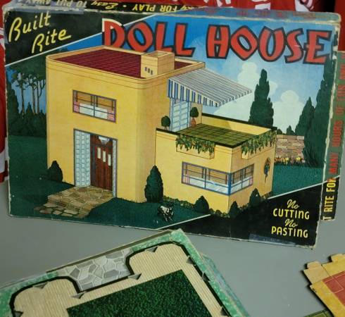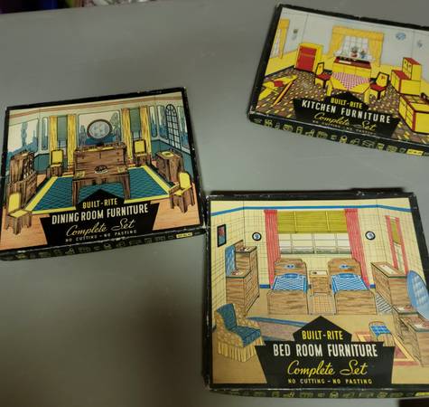 Rare Built Rite Cardboard Dollhouse with Furniture, includes living room, dining room, kitchen, bedroom and bath furniture sets, circa 1940’s, never played with, $79 OBO