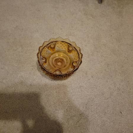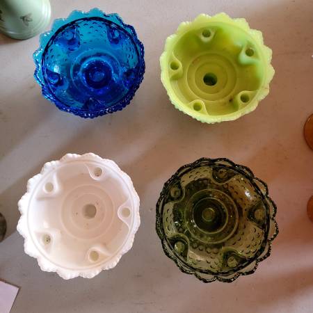 Fenton Candle Bowls, hobnail w/scalloped edge: colonial blue (sold), white (sold) , colonial green (sold), lime green $10, amber $5