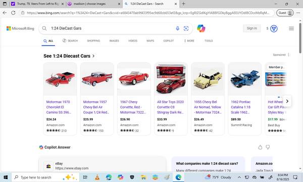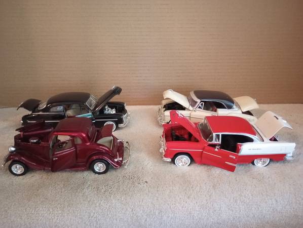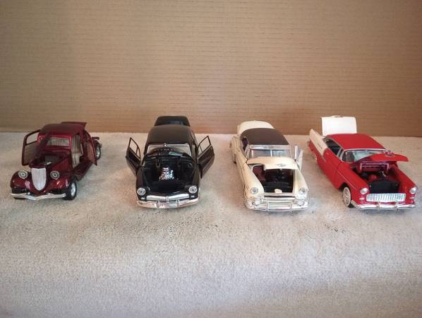 Four 1:24 scale diecast classic cars. If ad is showing, it's available. $40 for all. Reply with phone number by email/ chat feature for prompt call-back.