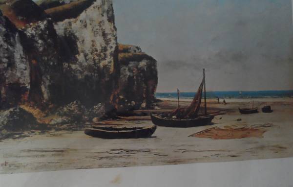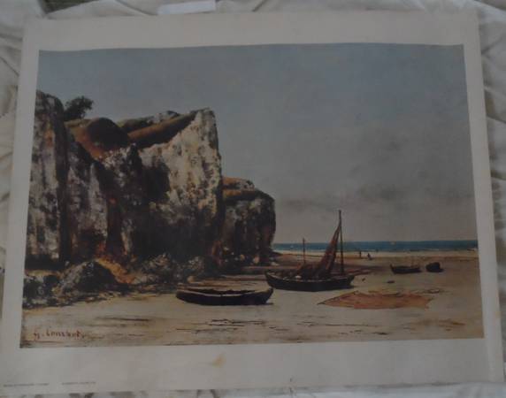 ART POSTER: A poster showing “Beach in Normandy” by Courbet from the Waskewich Gallery Ltd.. Poster circa late 1970/early 1980. Size: 28x22.5 inch on mat finish poster paper. Used, has some tape residue on back corners/edges, pin hole in each reinforced corner, a few wrinkles, excellent shape.