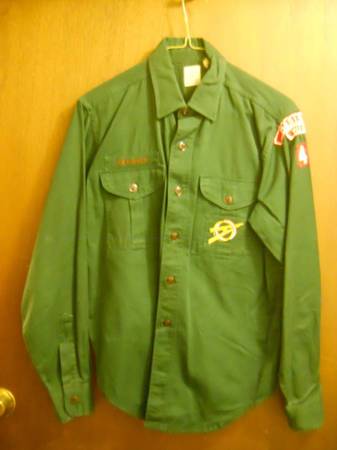 =Explorer dark green long sleeve shirt, Size: neck 16 ½, sleeves long. Explorer strip over pocket. Old red and white “Madison, WI” on right shoulder sleeve. Used, excellent shape. $10.