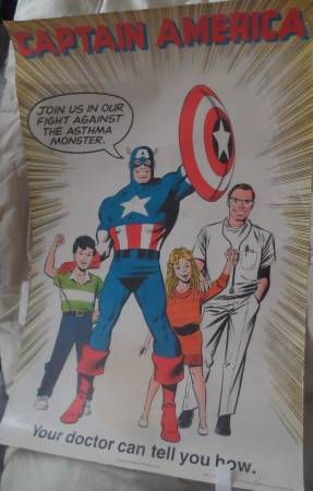 CAPTAIN AMERICA POSTER: A 1987 heavy paper glossy stock poster of Captain America promoting the fight against asthma. Produced by Glaxo, Inc. Size: 22x33 inch. In excellent shape.
