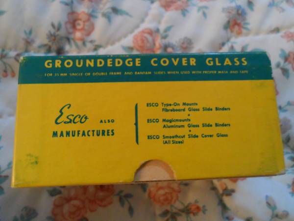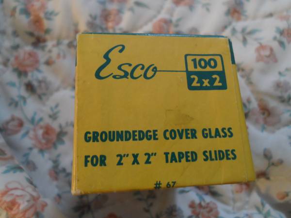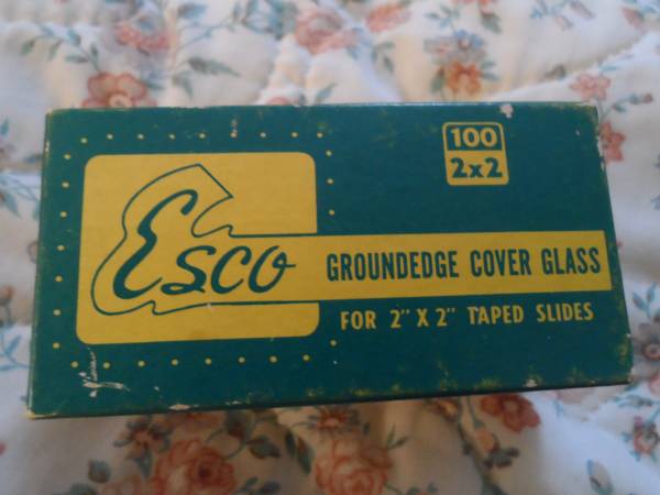 ESCO GROUND EDGE COVER GLASS: A vintage, pre 1970's, box of 2x2 inch glass for 2x2 inch taped slides. Box open, 100 slides, (might be 1 short), box has some minor wear from age but otherwise in excellent condition. Glass in new condition.