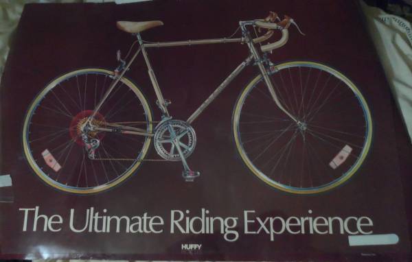HUFFY AEROWIND: Huffy Bicycles introducing the Huffy Aerowind “The Ultimate Riding Experience”. Huffy Bicycles' first Aerodynamic Designed bike of the 1980's. Rather tame aerodynamics by today's standards. Circa 1983, Size: 34 x 24 inch. Some minor damage on edges.