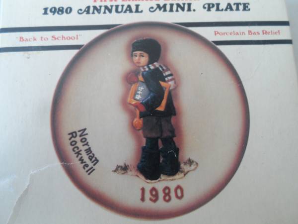 MINI PLATE: A Norman Rockwell First Limited Edition 1980 Annual Mini. Plate. “Back to School,” Porcelain Bas Relief, from the Dave Grossman Design Collection, #2035/10,000. Inspired from the January 8, 1927 cover of the Saturday Evening Post. For decorative use only. Plate is 3 inch in diameter and is in new condition, box has a tear and some wear. Size: 4.25 inch round, 0.5 inch thick.