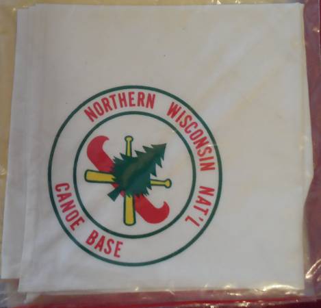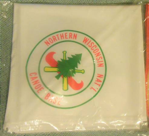 BSA NECKERCHIEF: A Northern Wisconsin Nat'l Canoe Base Neckerchief. White cloth with Canoe Base Logo printed on it. This Canoe Base has been shut down and closed. New, still in original factory sealed package. Have two new, one slightly used.