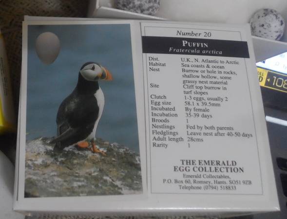 REPLICA BIRD EGGS: Emerald Collectables, PO Box 60 Romsey Hampshire, SO51 9ZB Great Britain replica bird eggs. Hand crafted and hand painted hollow replica eggs. Each egg comes in its own box with a card showing the bird on one side and information about the bird on reverse, found under cotton at box bottom. These are getting harder to find as last made in the 1990's. Also have crystal egg holders by Waterford Crystal, Ireland. Eggs $10 each and Crystal $20 each.