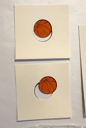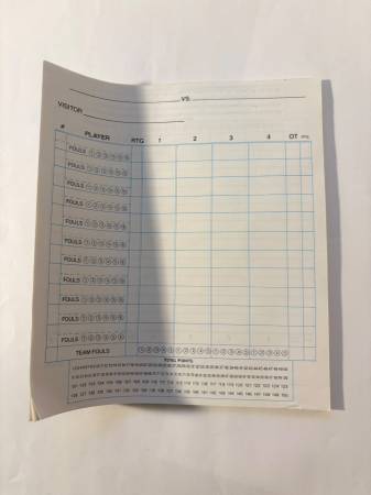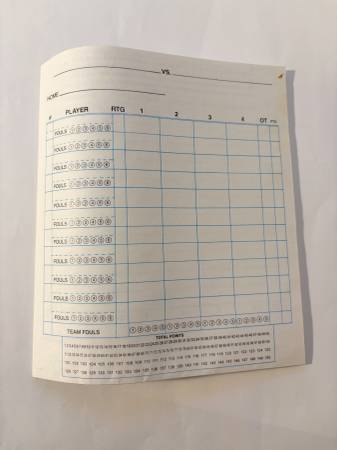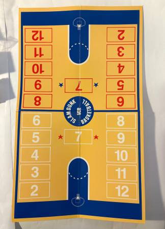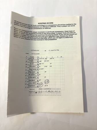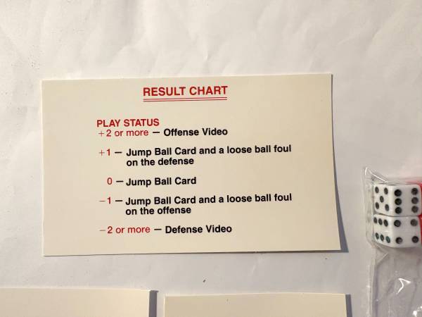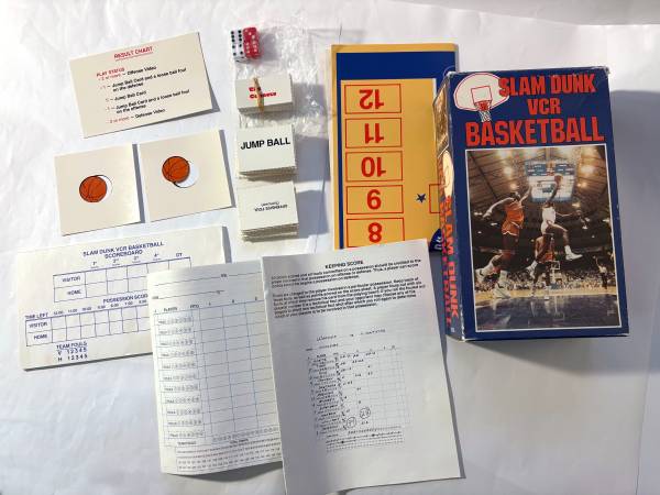 Contains: 1 VHS tape, 44 player cards (separated), 2 basketball markers (punched out), 1 scoreboard pad, 1 pad of scoresheets (curved), 1 game board, 1 result chart, 4 dice, and one instruction booklet (curved).