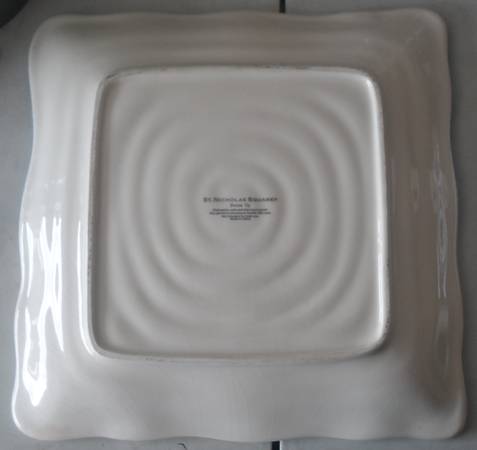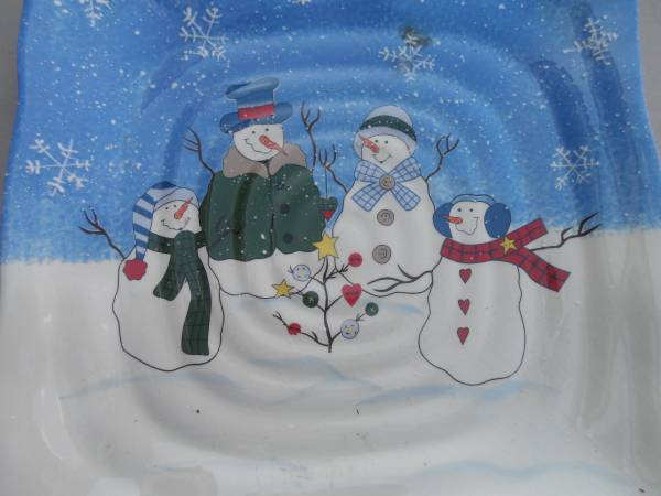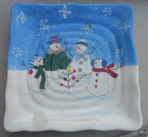 WINTER SCENE PLATE: A Square Winter Holiday ceramic plate depicting a family of 4 snow people. Size: 11x11x1.25 inch. Made by St. Nicholas Square, Button Up. Dishwasher safe, microwave proof, not intended for oven use. Excellent Condition.