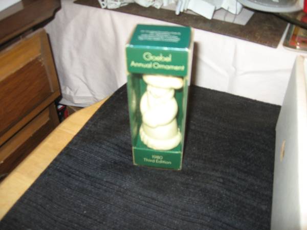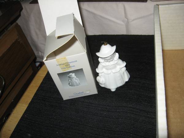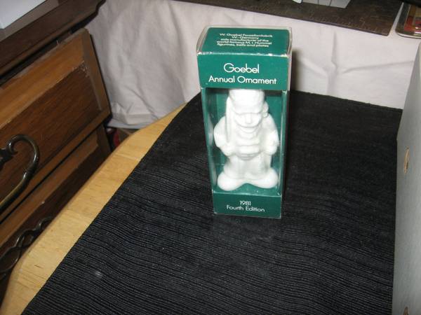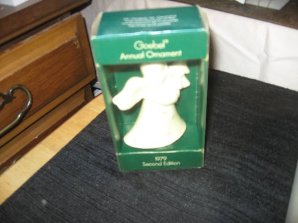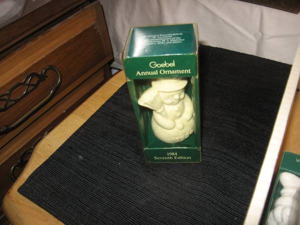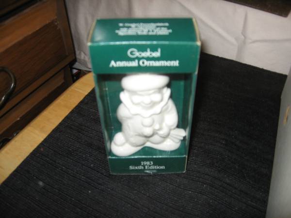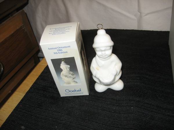 I have twelve of these Goebel Annual Ornaments for sale. I am asking 10.00 each or all for 100.00. Included: 1986 9th Edition 1983 Sixth Edition, 1980 Third Edition, 1982 fifth edition 1981 Fourth Edition, 1984 Seventh edition, 1978 First Edition, 1979 Second Edition, 1985 Eighth Edition, 1987 10th edition, 1988 11th edition, and 1989 12th edition. These are all in good used condition. Pick up at my home in Portage.