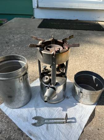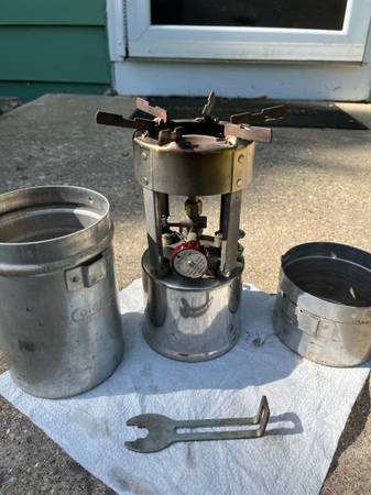 Gorgeous No.530 Coleman B46 compact camp stove. Produced only in 1946 and 1947. The nickel plating is in amazing shape. Fires up like brand new. Still has its tethered fuel funnel and pot handle/ wrench. Carry case/pot/cup in very nice condition. This one is in perfect working order with all original parts in excellent to like new condition. This gem won’t last long. Cash only. I have several other vintage Coleman stoves and heaters as well.