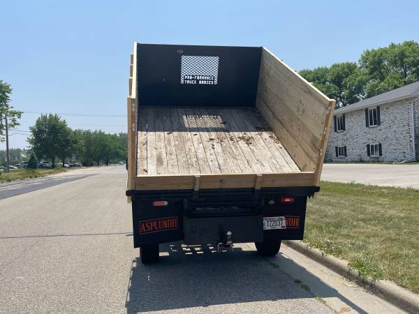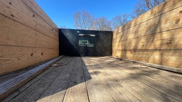 The bed is 9 feet long, 6 feet 8 inches wide. The bulkhead is 3 feet 4 inches high. The volume of the box is just over 200 cu ft!!! A 12’x8’x2’ dump trailer would be 196 cu ft. Wooden deck. Steel bulkhead.