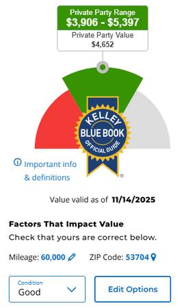 Kelly Blue Book price for this year, model, and mileage, in "good" condition is $3,906-$5,397