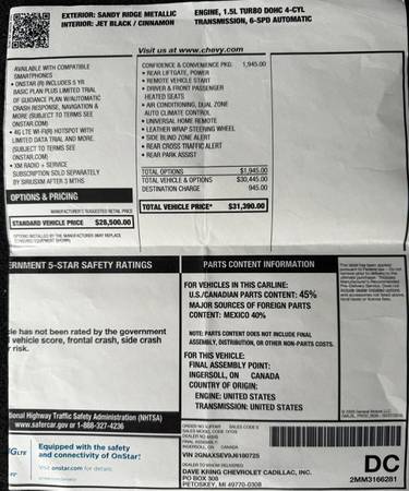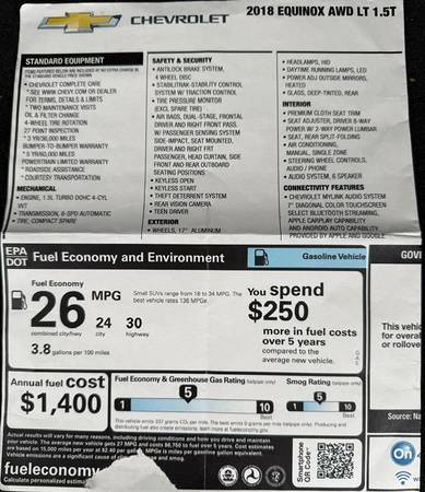 Selling 2018 Chevrolet Equinox AWD LT with 1.5L Turbo for great mileage. Car has small dent by passenger side rear wheel and scratch on drivers side rear door. Otherwise, car has all available options. Original stickers are in photos. Car was purchased at Bachrodt Baraboo Motors with extended warranty and service plan, good for another 1 1/2 years. I am posting for a friend, so I will forward serious inquires to the owner. Only reason for selling is they are no longer able to drive due to health issues.