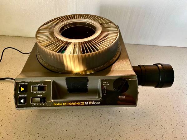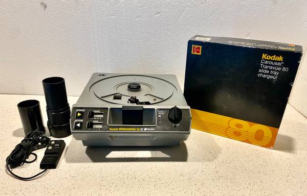 Kodak Ektagraphic III AT / AF Slide Projector with (2) Lens, Remote & Slide Tray. The projector has been Used and s in working order. LQQk at All the photo's they are the main Description, Projector has AF - Auto Focus Working, Has Auto-Time - We couldn't get it to work? Has a Pop Out Reading light on side. Comes with working lamp at time of shipping, (1) Tray & Remote. Remote stores in compartment on side of projector. It is being sold As Is due to Age & Being Used. Thanks