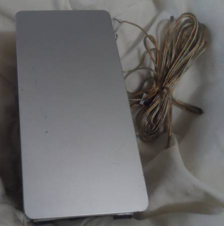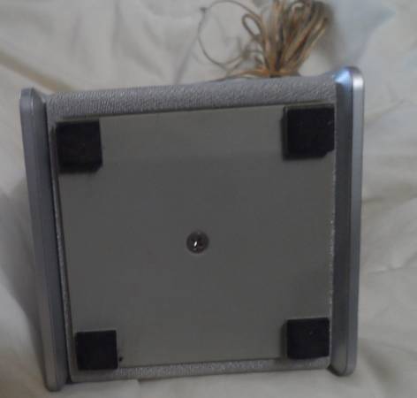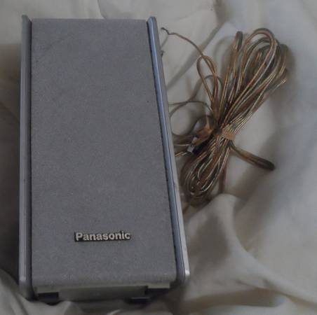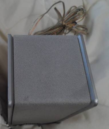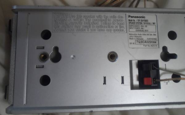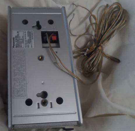SPEAKER: A small Panasonic Brand speaker, part number N2514. Impedance 6 ohms, Input Power 60 Watt (music). Silver color: cloth front, plastic case, rubber feet, hole to hang on back, 13 feet of silver/gold color two strand wire. Used. Have only the one speaker. Size: 3.5 x 3.5 x 7 inch.