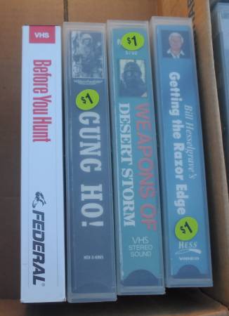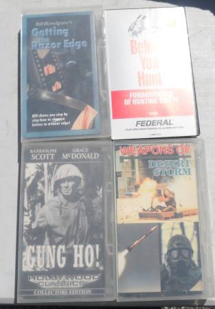 VHS TAPES in cases, Four left. Movies: Gung Ho and Weapons of Desert Storm. Instructional: How To Get The Razors Edge and Before You Hunt.
