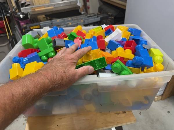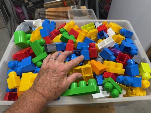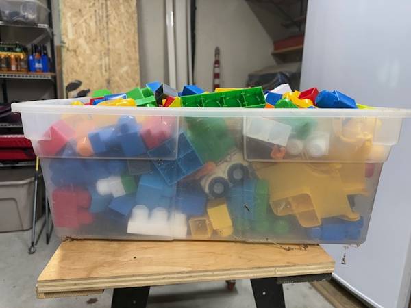 Big bunch of Duplos (which are like big Legos), clean. Does not include container.