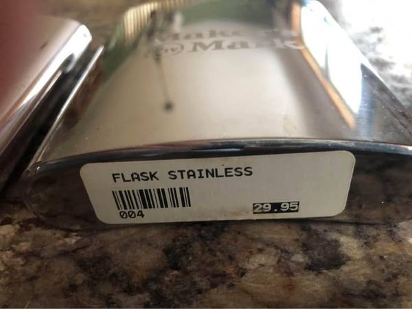 Whiskey flasks 7 ounce each. Stainless steel. Never used. One was a gift, one a groomsmen present. One says “Chip”, the other says “Makers Mark”. Still has price and barcode on it. Don’t use. $10.00