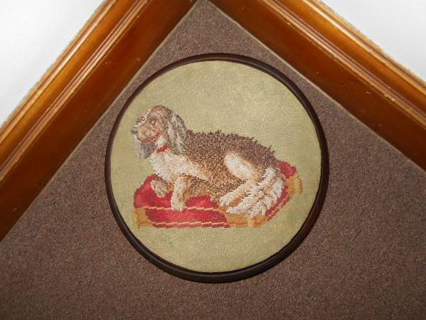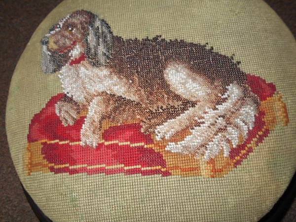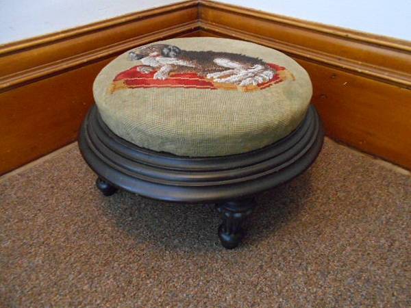 Offering a Hand-Stitched Dog Cushion Wood Stool, small size, excellent used condition. Fabric is a moss green or forest green color with a Cocker Spaniel stitched into it. Cushion is firm and still holds its shape well. The wood bottom has ornamental carved legs, all dark stain throughout. I circled a small, minor wear spot on the fabric of the stool. This is a smaller stool and it is in an indoor storage facility, and I forgot to get the measurements before posting, but I can get them if needed.