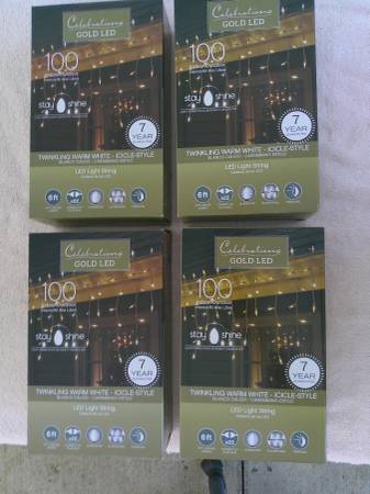 For sale are 4 NEW boxes of Celebrations Gold LED Icicle string lights. Each box contains 100 twinkling icicle light string. These are for indoor/outdoor use and 6 ft. long. I am asking $20 (CASH ONLY) for this 4 box set and can be contacted through this listing or at the number given. Thanks
