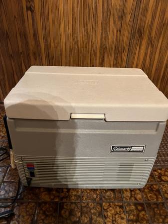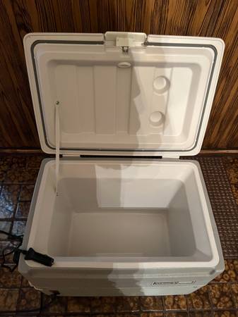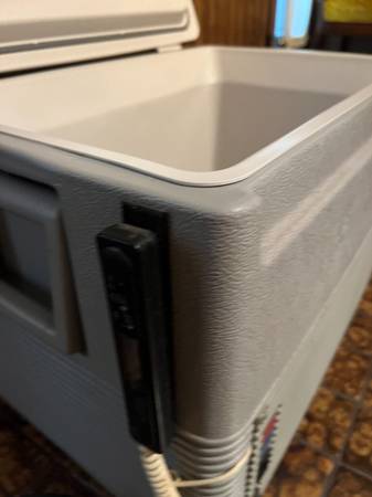 Great 12-volt cooler for tail gating or camping. Keep food cool without ice, just plug it into a vehicle 12 cigarette lighter outlet. It can also work as a warmer, to keep food warm. Has a thermostat to monitor the temperature.