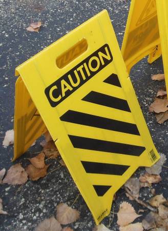 FLOOR SIGNS: Yellow plastic CORE PLAST signs (have x6) extra weight has been added for stability when used outdoors in windy conditions. Size: 11 x 19 inch.