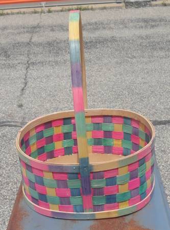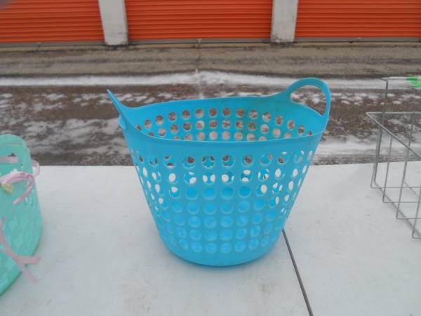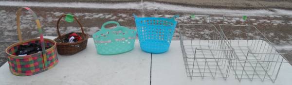 BASKETS: Plastic “Easter Baskets” with handles. Have the two. Blue 9x11x8H inch. With pink ribbon 12x7.5x5H inch. Both for $1.