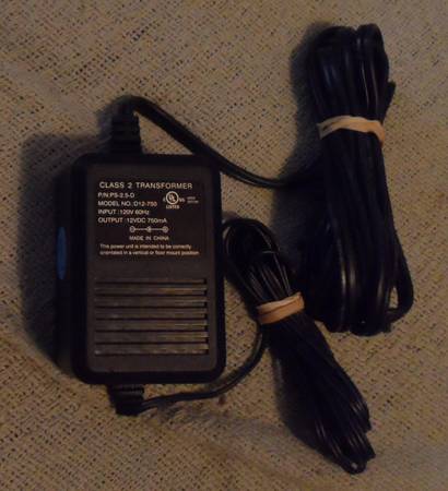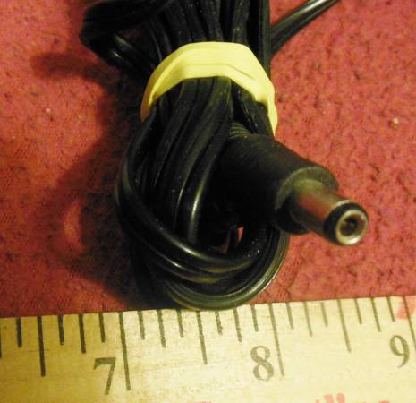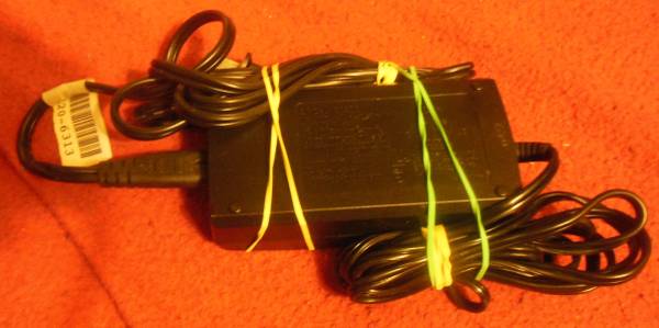 =18VDC output: SRC-U180200, Input: 100-240V 50-60Hz 1.0A max., Output: 18V 2.0A. 2 prong male wall plug, small round plug with center (+) post.. 6' cord to wall, 6' foot cord to device. $10.