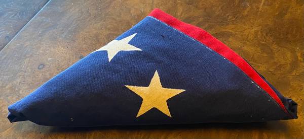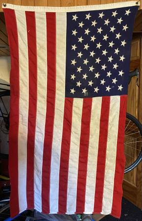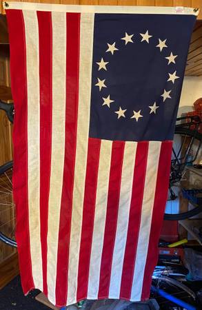 Two American flags, $20 cash-only each. Both are 100% cotton, 3' x 5', in very good condition, with grommets at each corner of the stars end of the flag. Both are properly folded into a triangle. Buy one or both: 1) Current 50-star flag, and 2) 13-star circle Betsy Ross flag