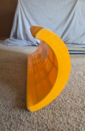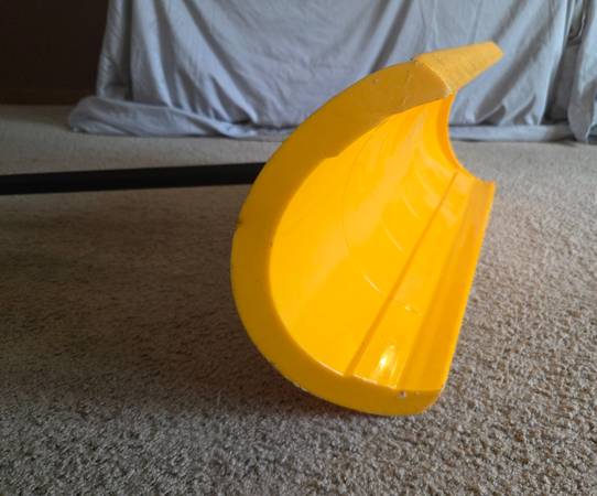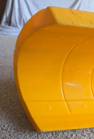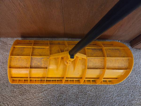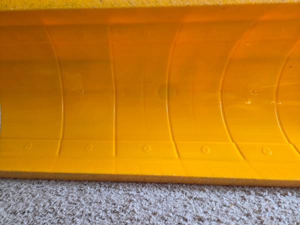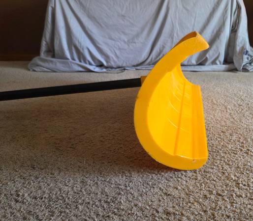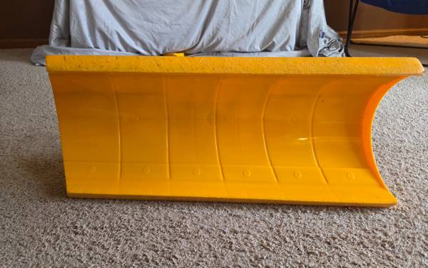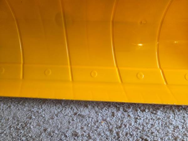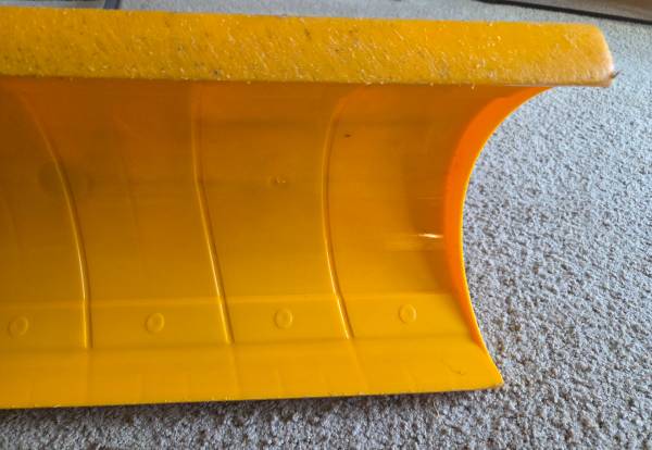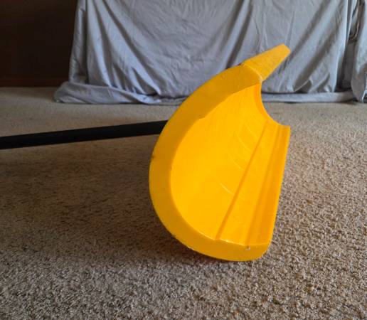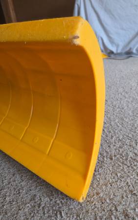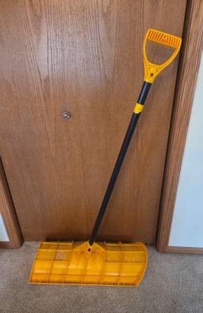 Used and in great condition, it just has scraps and scuffing on the edges of the shovel head from normal use but otherwise excellent. No cracks, chips or breaks. Perfect for residential and contractor use, this snow pusher is built to last. Impact-resistant poly construction with structural reinforcements. Superior materials ensure strength in all the right places. This product is ergonomically engineered for maximum force at the blade of the shovel. Heavier and very durable. Bright yellow hand grip and shovel head with a black pole. The shovel head is crescent shaped for easy pushing. It's 54" tall x 26" long x 11" wide. The shovel head is about 26" long x 11" tall x 6" wide.