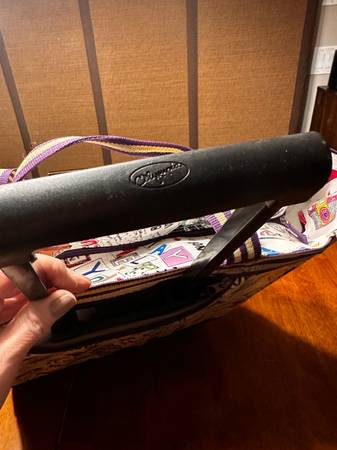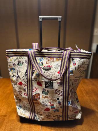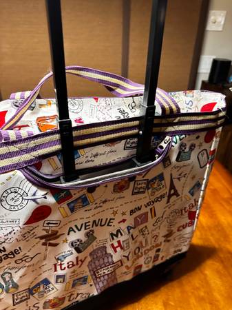 Super Cute- LIKE NEW- Olympia Cosmopolitan Rolling Shopper Tote. Constructed of durable tarpaulin, it includes ball bearing style wheels for a smooth gliding. 24" tote bag with a retractable handle, which easily hides away beneath a zippered closure. It has a convenient front pocket and a large main compartment for storing clothing and accessories.