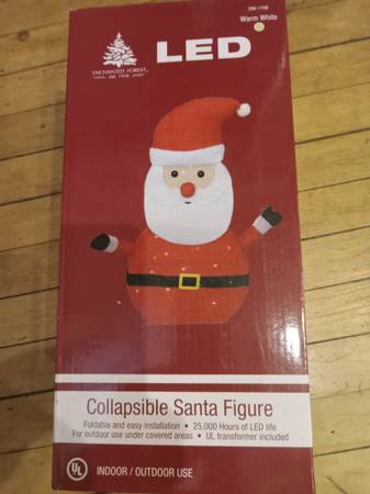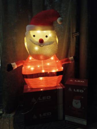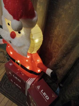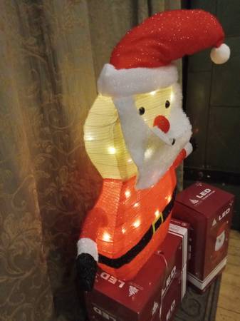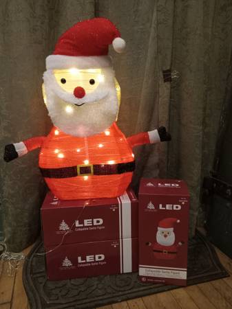 I have a total of 4 brand new collapsible Santa decorations. They have plug-in LED lights. 27" tall x 26" wide x 6" deep. Just fold them open and expand them like a spring, held open with the...
