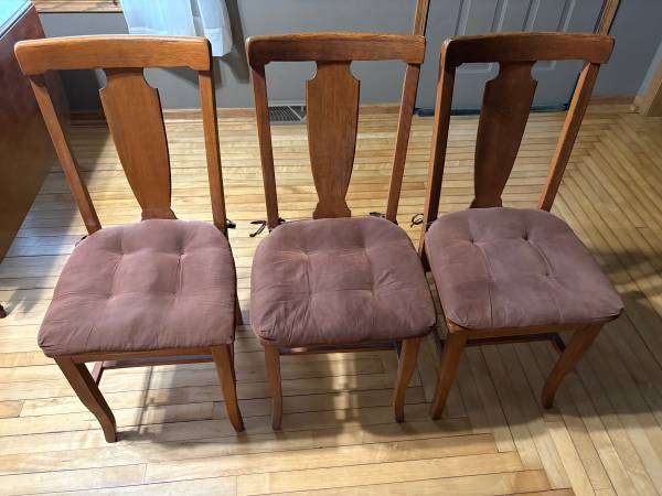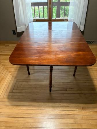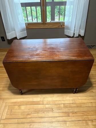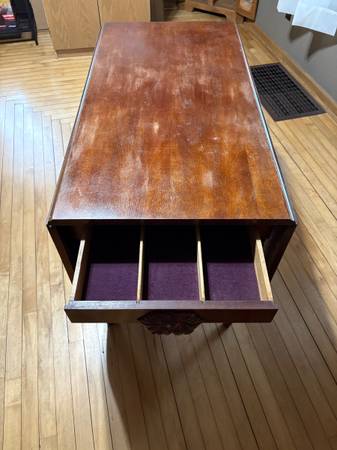 Leaf table. 42 L x 23 W when closed. 62 L when open. Drawers open on both ends. 3 chairs included. $50