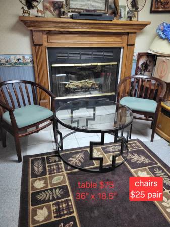 SOLD in pic with glass tABLE. $25 for 2 mahogany stained chairs. Very solid construction.