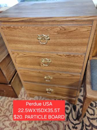 $20 Small paticle board chest of drawer. Solid not real wood piece Back corner bottom has a chip*quarter size. 22.5" wide x 15" deep x 35.5" tall