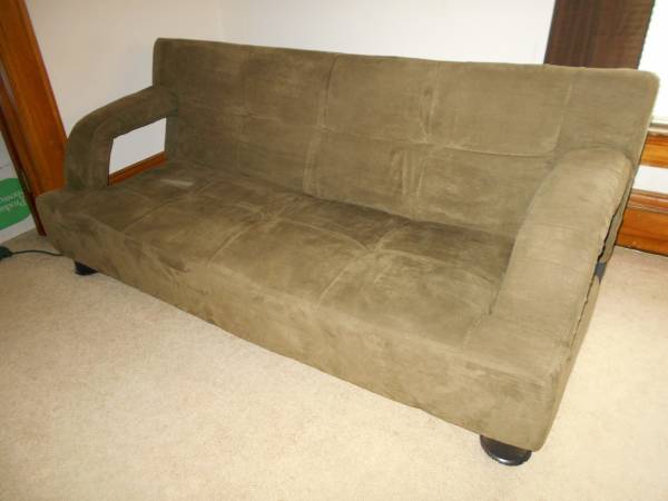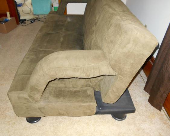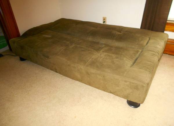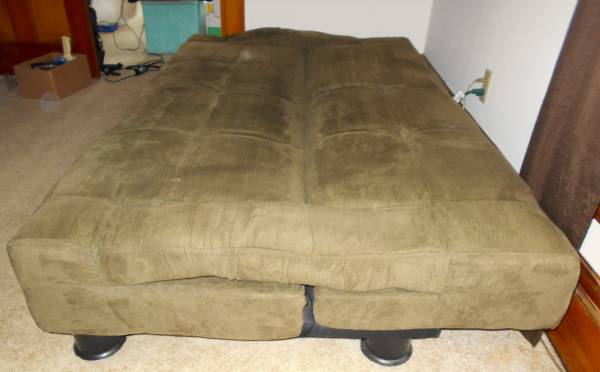 Offering a unique style Futon in what some would call forest green color or olive green color. Used with some wear, and has a white-ish discoloration on one of the seat areas. Overall it's in good condition otherwise and I very rarely used it for sleeping or even sitting. It was an extra in my apartment for guests. (For some reason, my JUNKY camera put occasional spots in the DIGITAL photos, like you used to see on Polaroid film. How this happens I do not know, but I took the pics while moving out and the apartment was cold. This happened before when I took pics in a cold basement.) As a couch the seat and backrest are 22in, the seating width is 60in or 5ft, and the overall height from the floor is 30in. And as a bed it measures 72in L x 44in W.