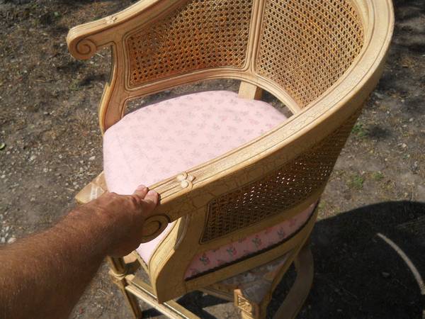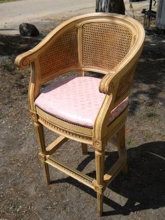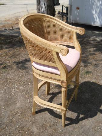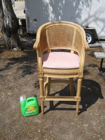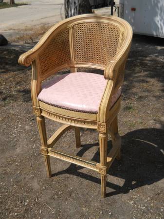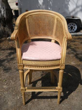 Offering a VERY HEAVY Vintage Old Hickory Tannery High Swivel Chair, great for a work space or home use. It has a cane back and sides with a large seat that swivels side to side about 180 degrees. It is made by Old Hickory Tannery and has a cracked paint antiqued finish. I don't know how to describe the color so please determine this from the pics for yourself. Bottom footrest has a brass protector across it. The seat is a pink pattern which is cracked throughout but none of the cracks are open, and I think it might be leather since this was made by a "tannery" furniture company. The seat measures 18in Deep x 17in Wide, and it is 30in High off the ground, so the chair sits somewhat higher than regular chairs. The OVERALL width and depth of the chair is 22 inches, and the backrest is 45 1/2 inches tall. Again, this chair is VERY HEAVY, and it is not likely to move much from wherever you choose to use it, and thus it is VERY STURDY. Good for a work table or a solo chair at a tall kitchen counter, and it will certainly draw some attention when others see it! Any questions feel free to ask.