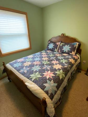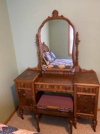 Vintage solid wood bedroom set from Sears circa 1930 includes std full-sized bed, mirrored vanity with stool, dresser. Mattress, box spring, sheets, and dust ruffle included. Bedspread/shams not included. Good condition, light scratches/water stain that can be easily sanded out, reinforced bed slates. Dimensions: Headboard 56.25”x 2”x 53”; Footboard 56.25”x 3”x27.5; Vanity 50”x 18.75” x 57”; Mirror 24”x 1.5” x 36.75; Stool 20.5”x 15.5”x 21.5”; Dresser 36”x 18.75x47.75