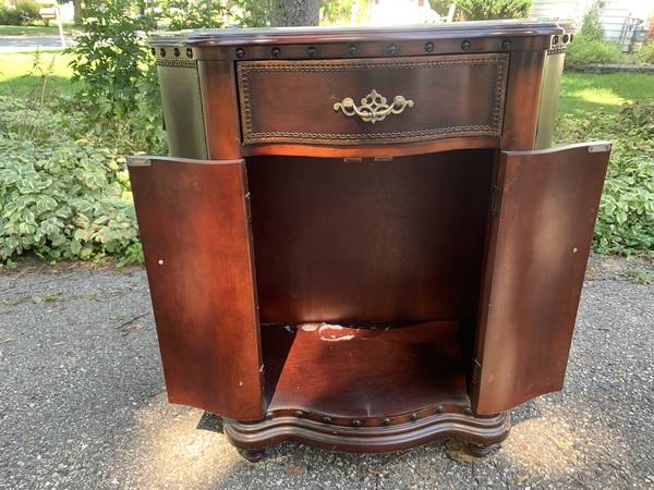 Restored cabinet with a drawer and two doors below. Refinished with a custom plexiglass top.